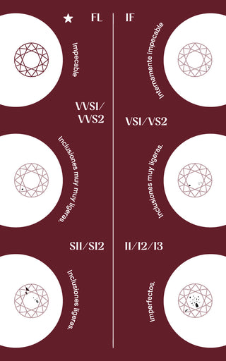 Clarity scale: 1.- FL (Flawless). 2.- IF (Internally Implacable). 3.- VVS1/VVS2 (Very very light inclusions). 4.- VS1/VS2 (Very light inclusions). 5.- SI1/SI2 (Light inclusions). 6.- I1/I2/I3 (Imperfect).